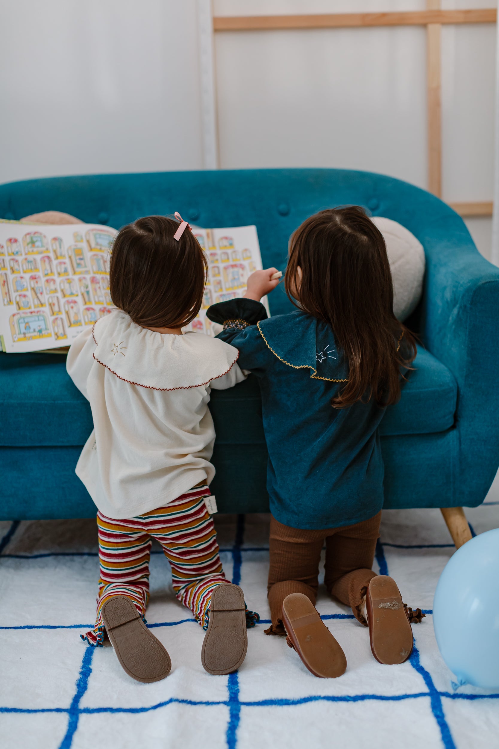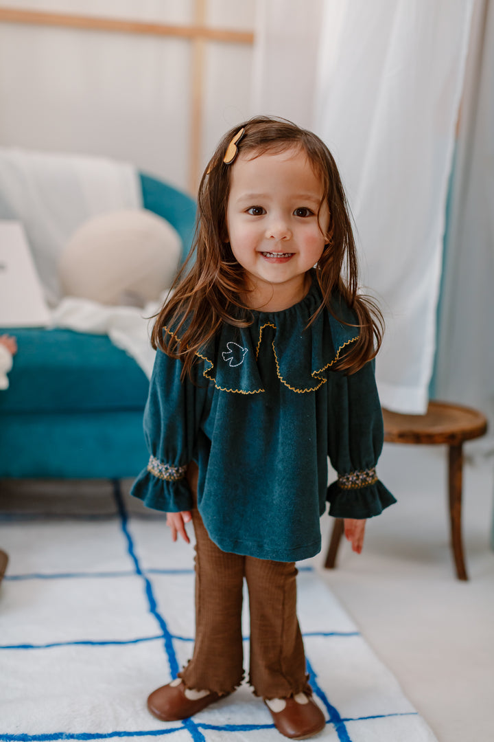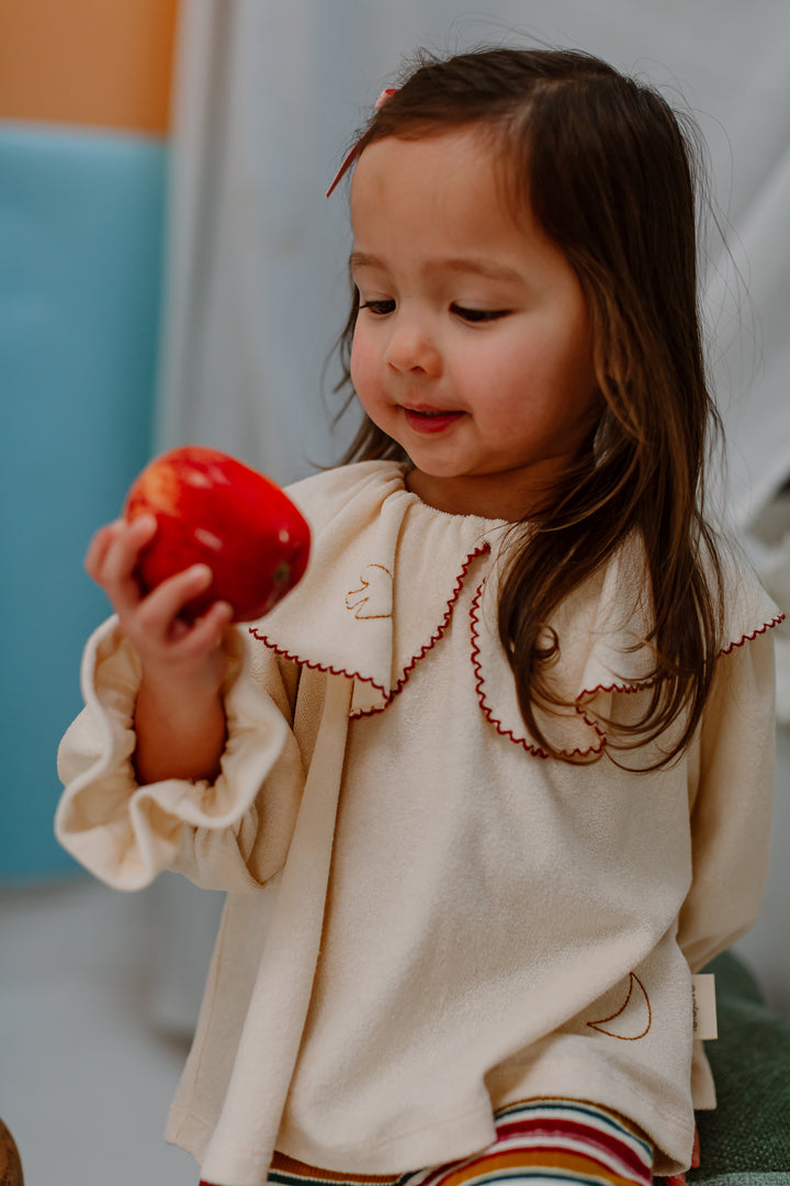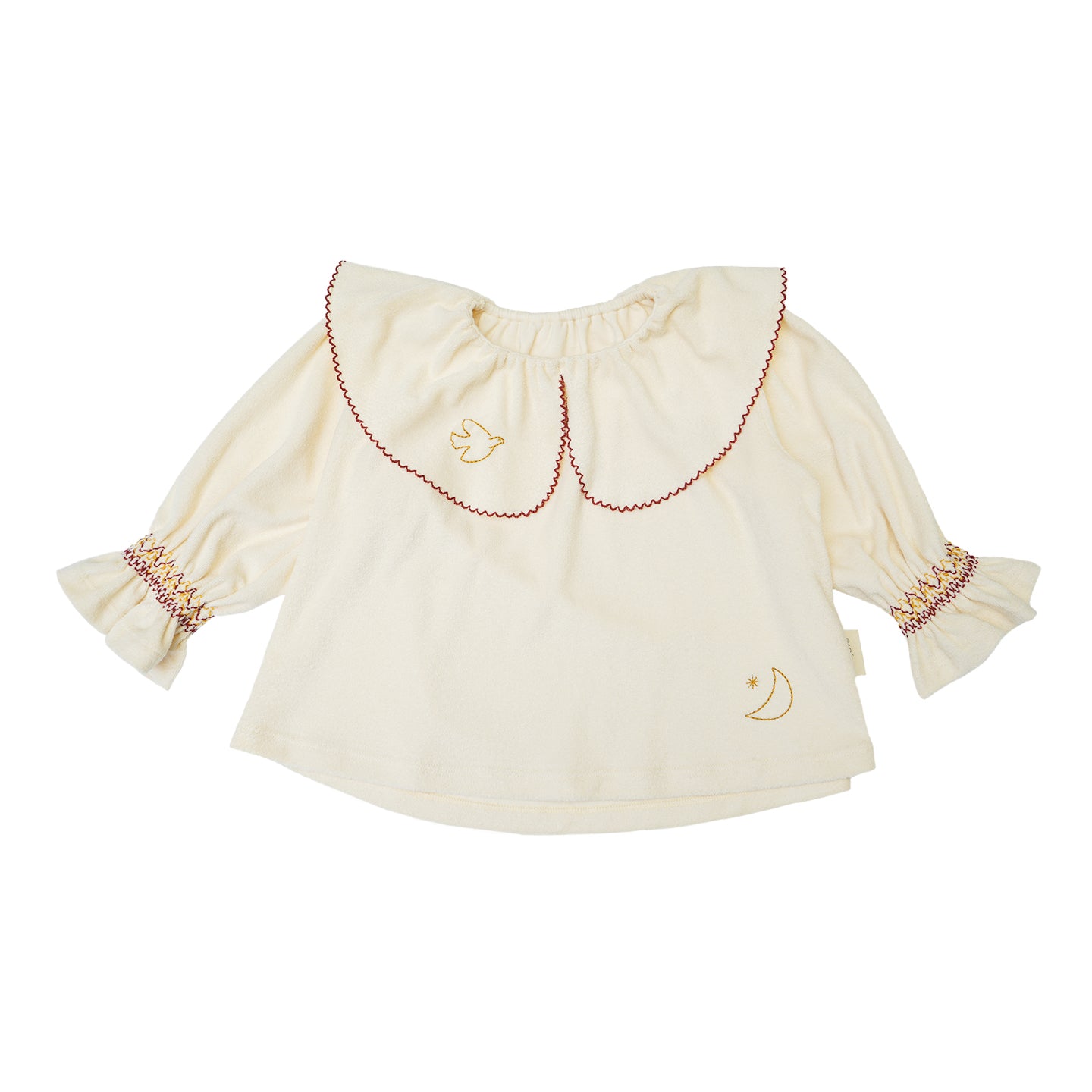 The Moon & Bird Embroidered Collar Top is made from a soft cotton–hemp blend with a gentle terry texture that feels breathable, plush, and comfortable against sensitive skin.