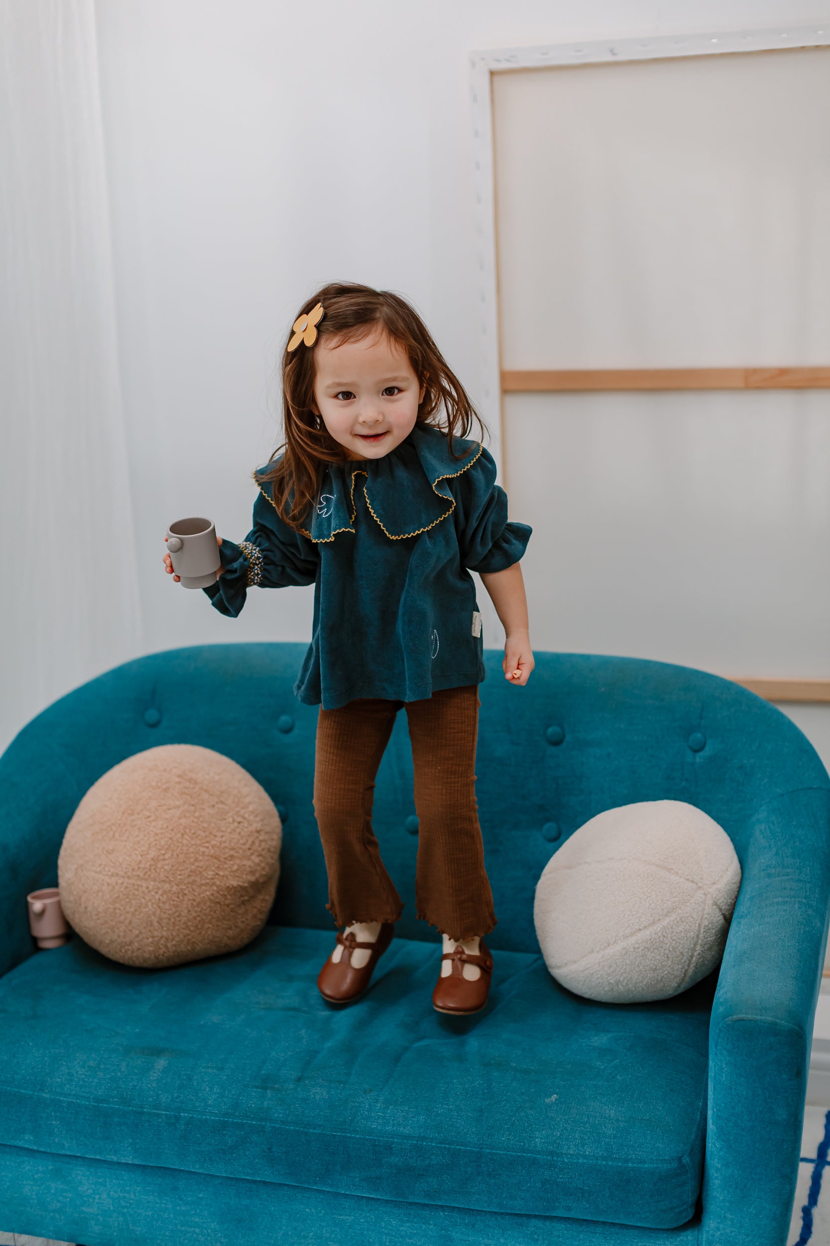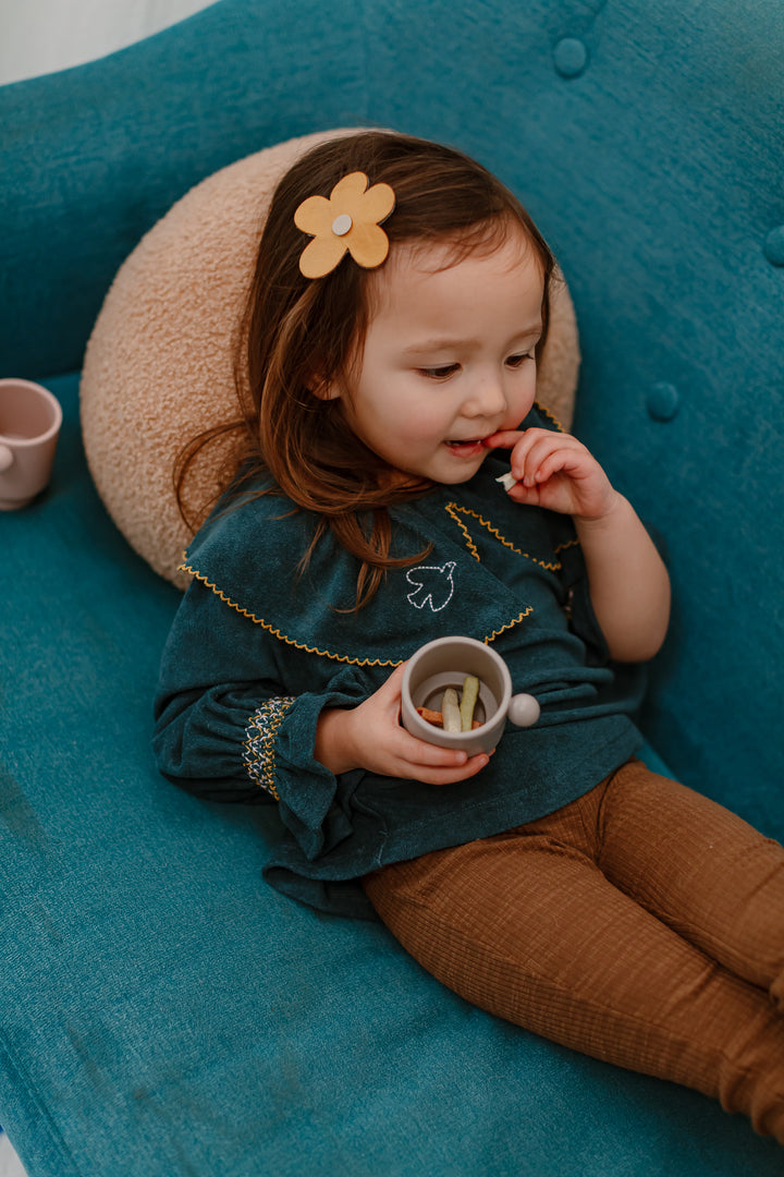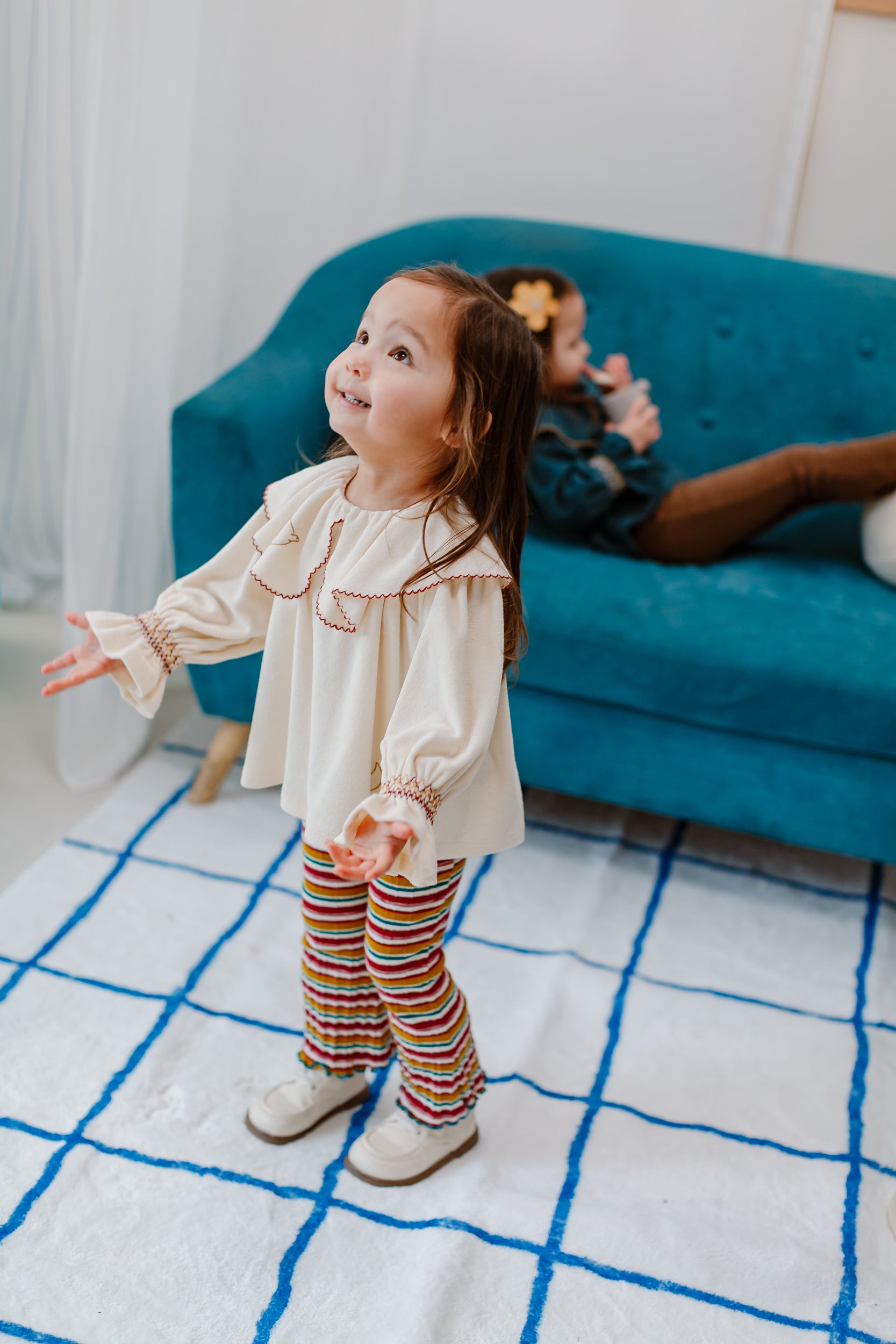 The Moon & Bird Embroidered Collar Top is made from a soft cotton–hemp blend with a gentle terry texture that feels breathable, plush, and comfortable against sensitive skin.