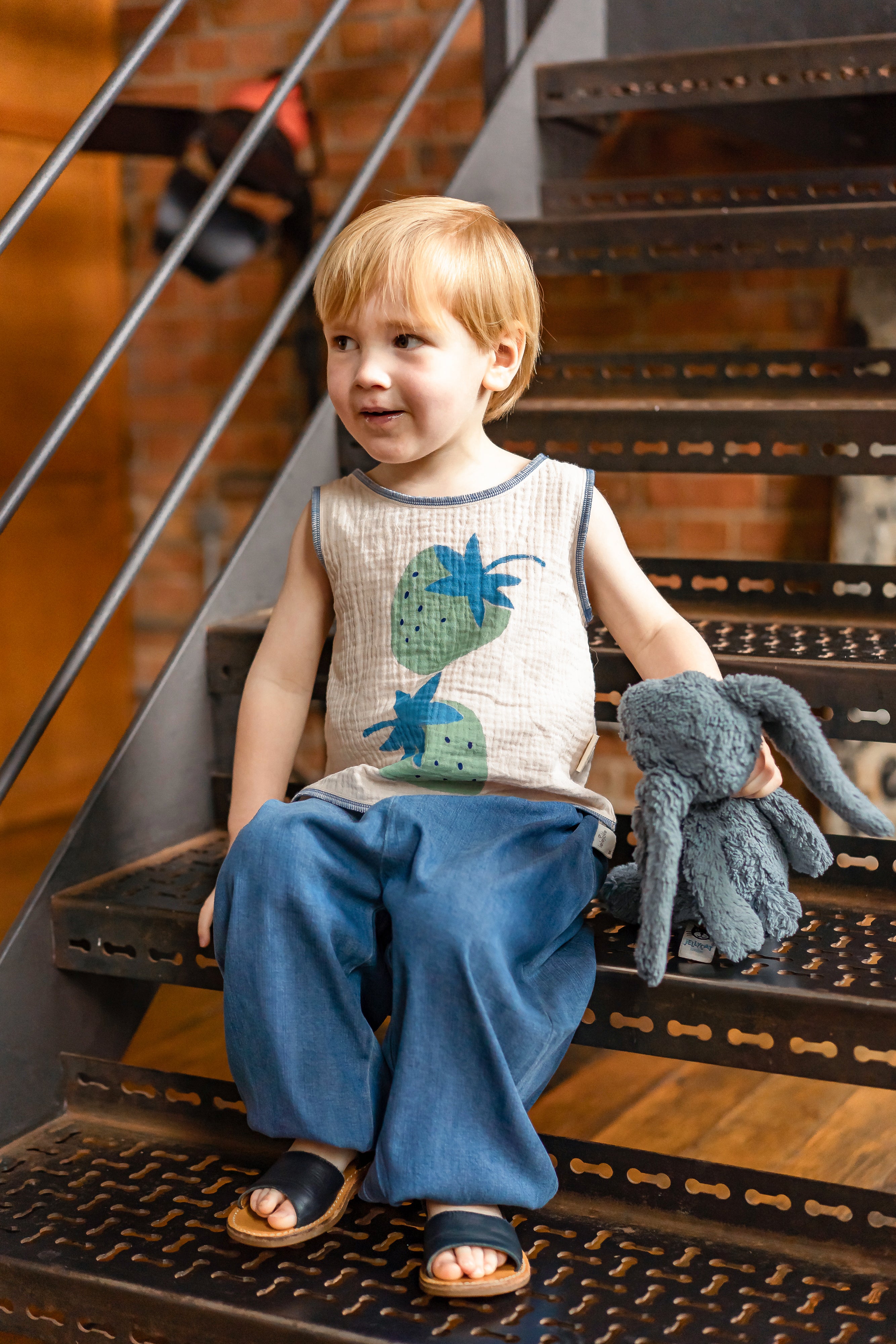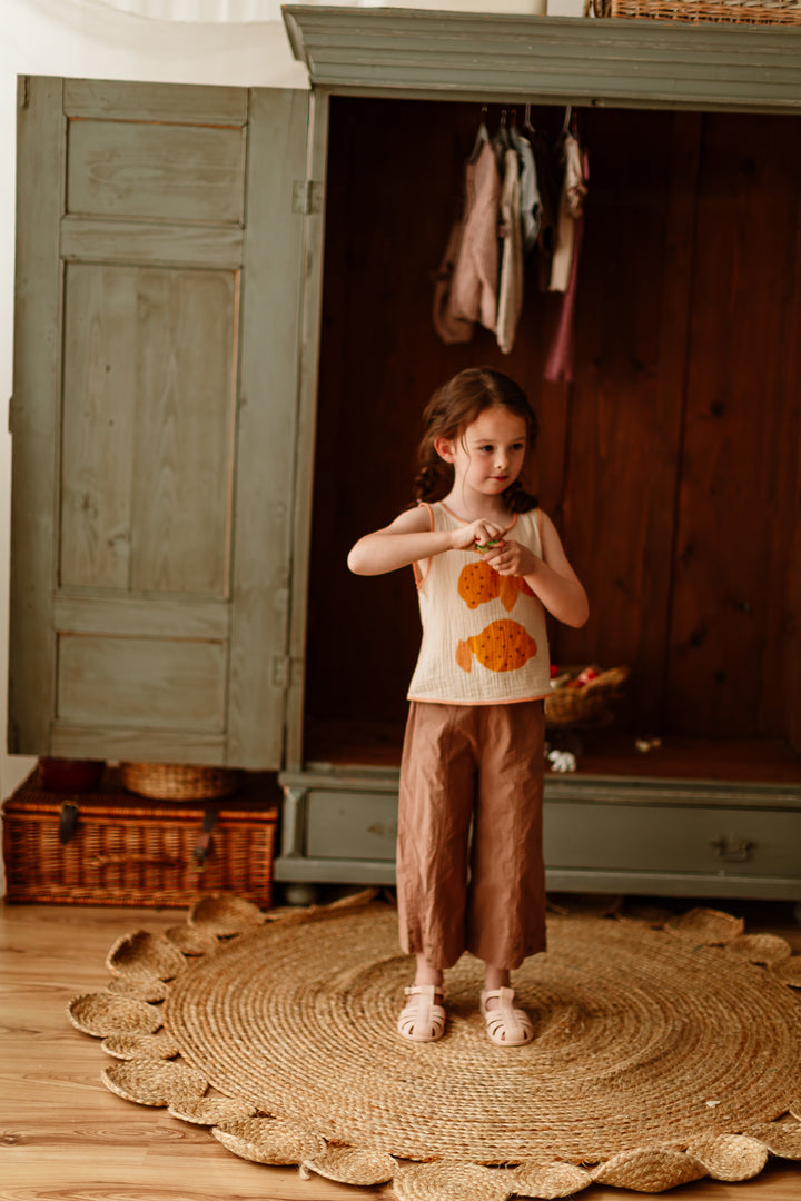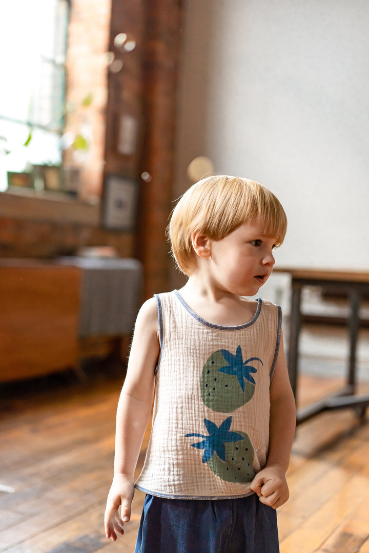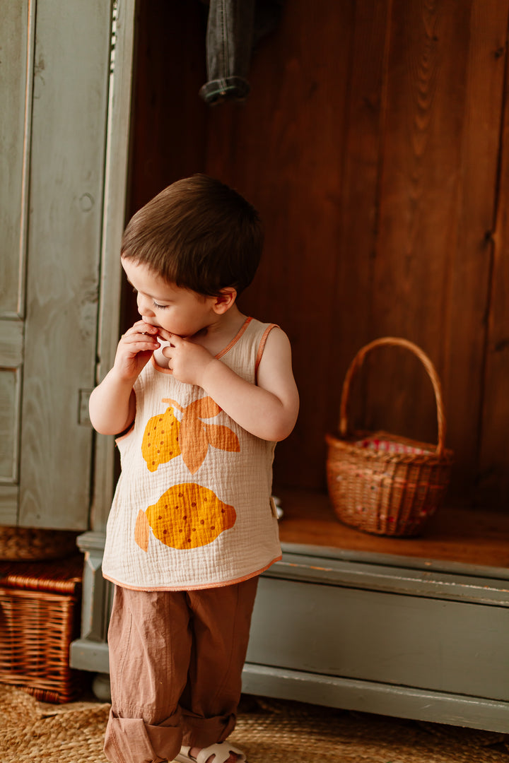 Designed with a lightweight double-layer yarn and playful fruit prints — choose from cheerful lemon or sweet strawberry. Sleeveless, breathable, and easy to pair with shorts or bloomers. Perfect for beach days, garden play, or just chasing bubbles at home.