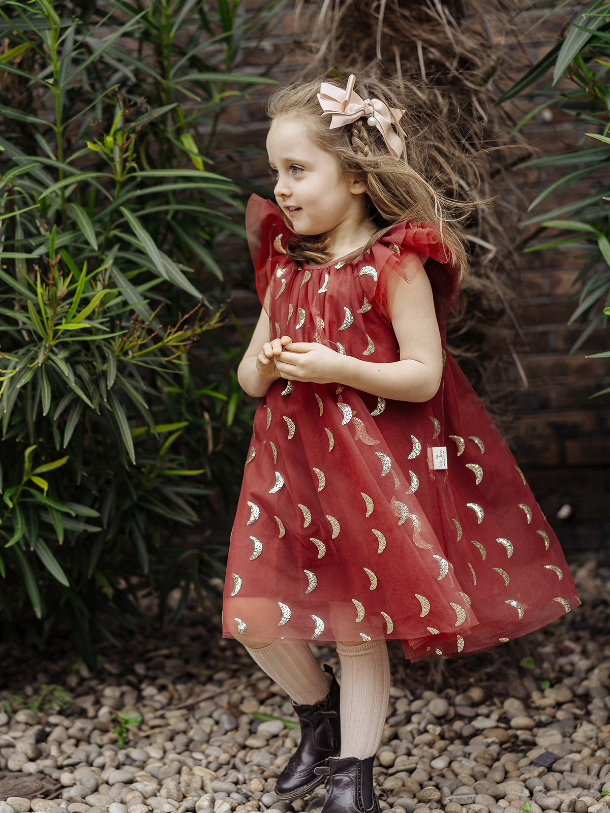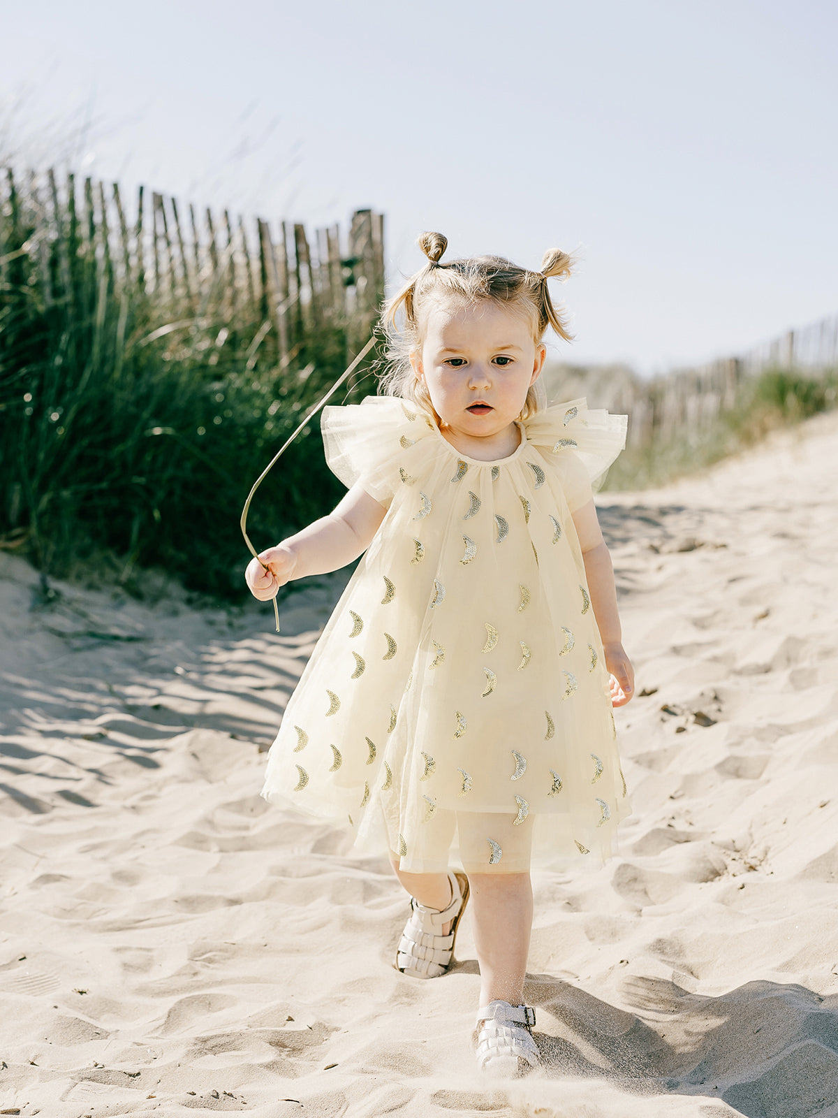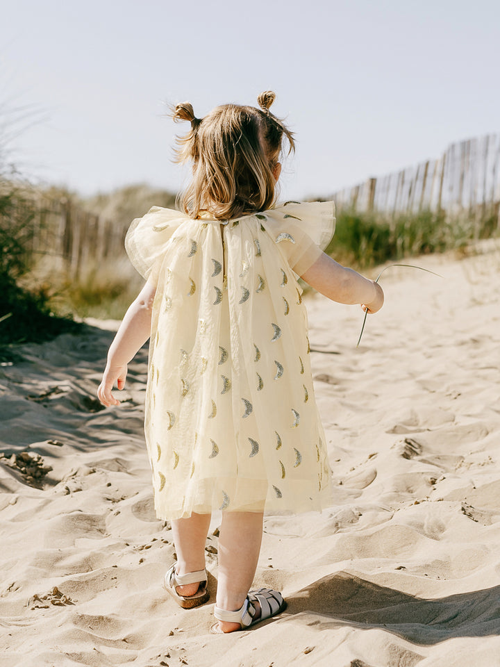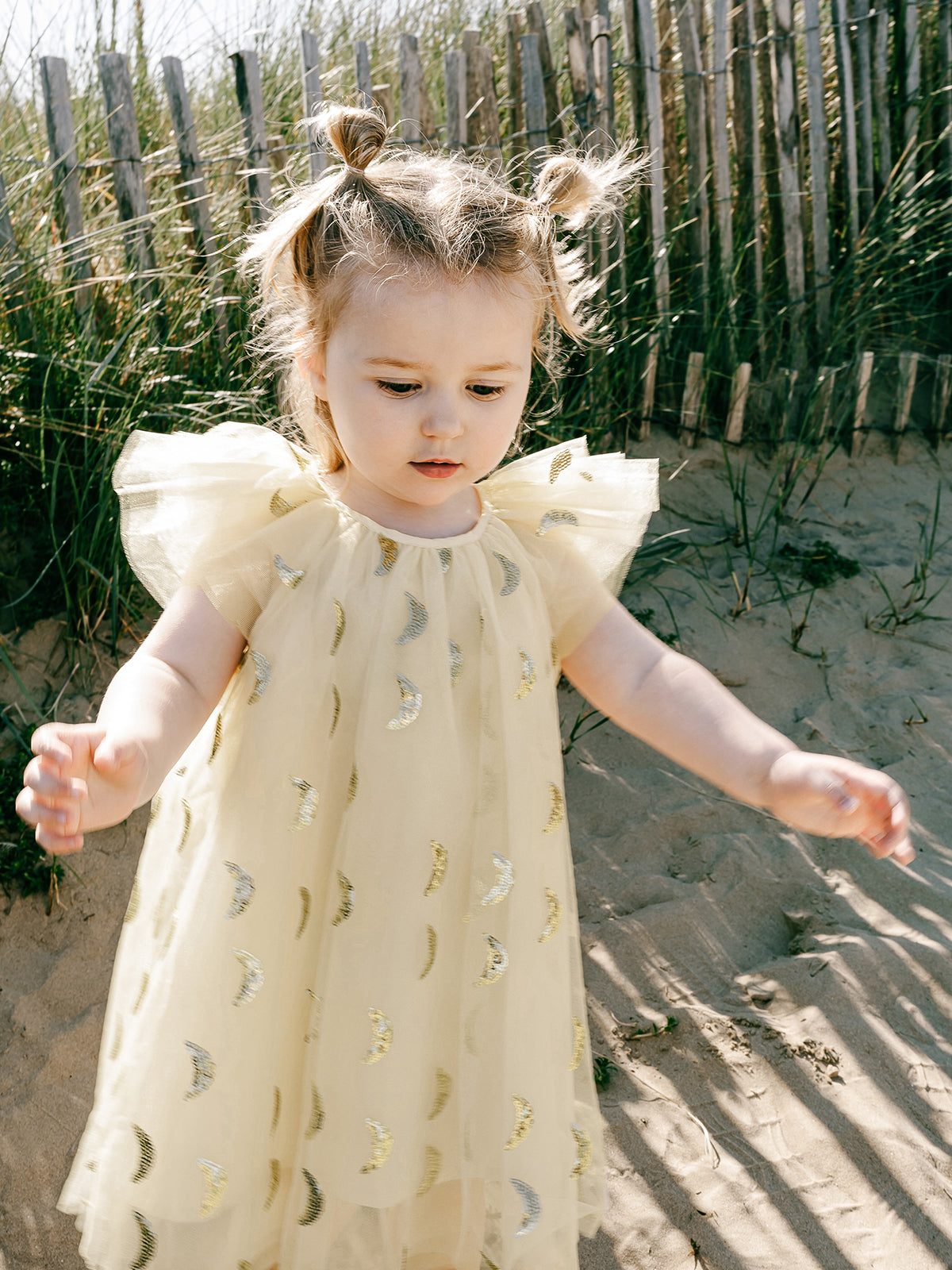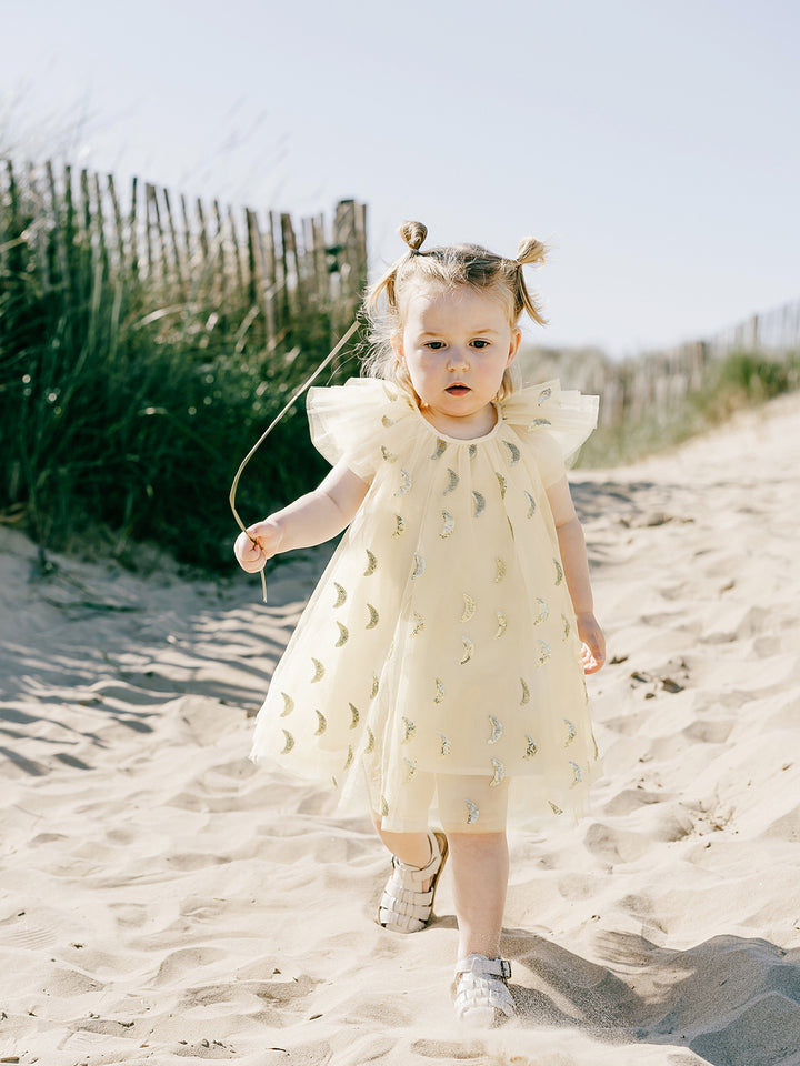 Princess-worthy silhouette with golden moon accents. Lightweight layered tulle flows gracefully with every step, making it perfect for parties, photos, and special moments. Soft on the skin and effortlessly magical, designed to make little girls shine.