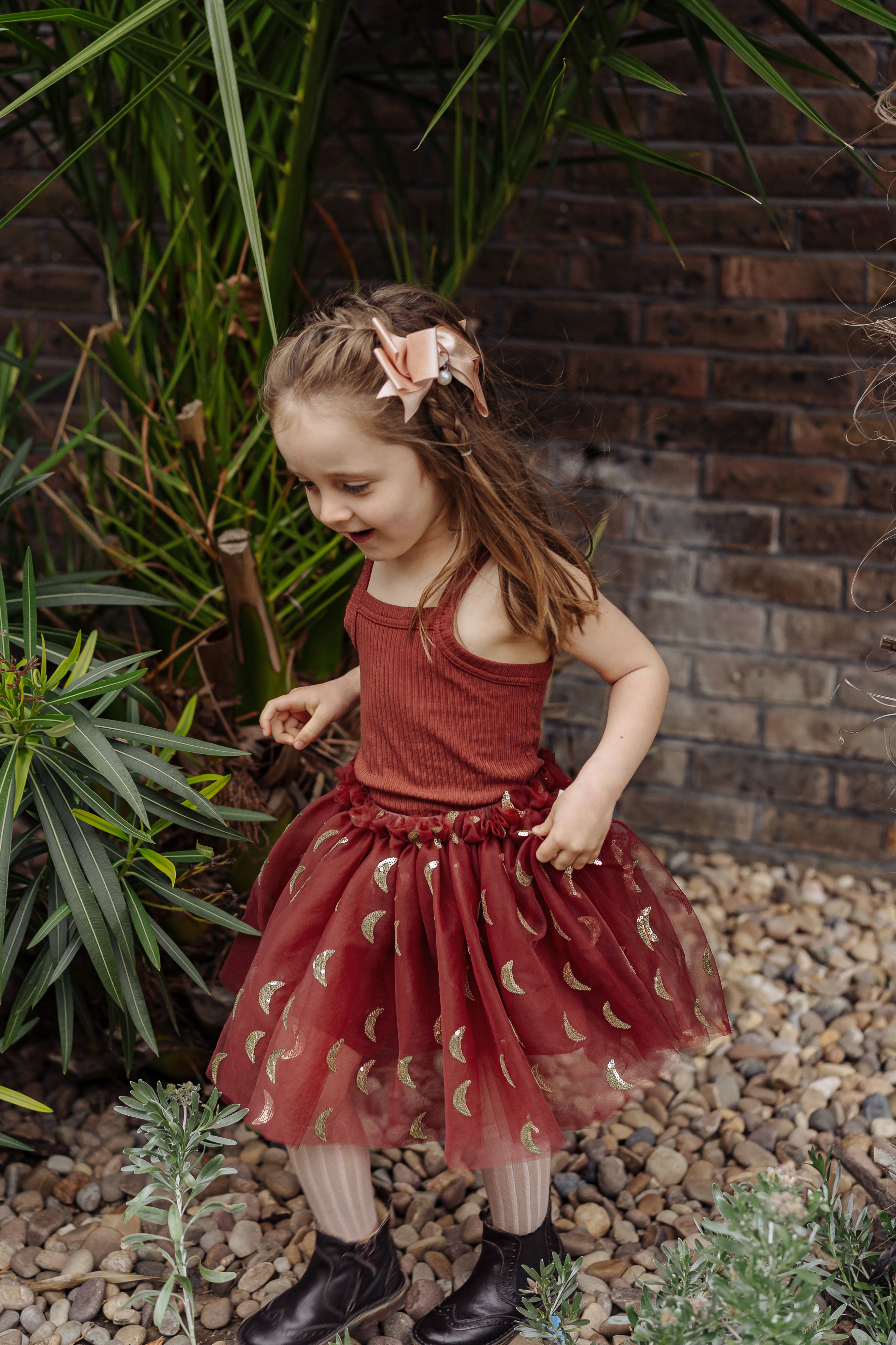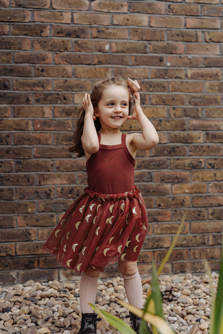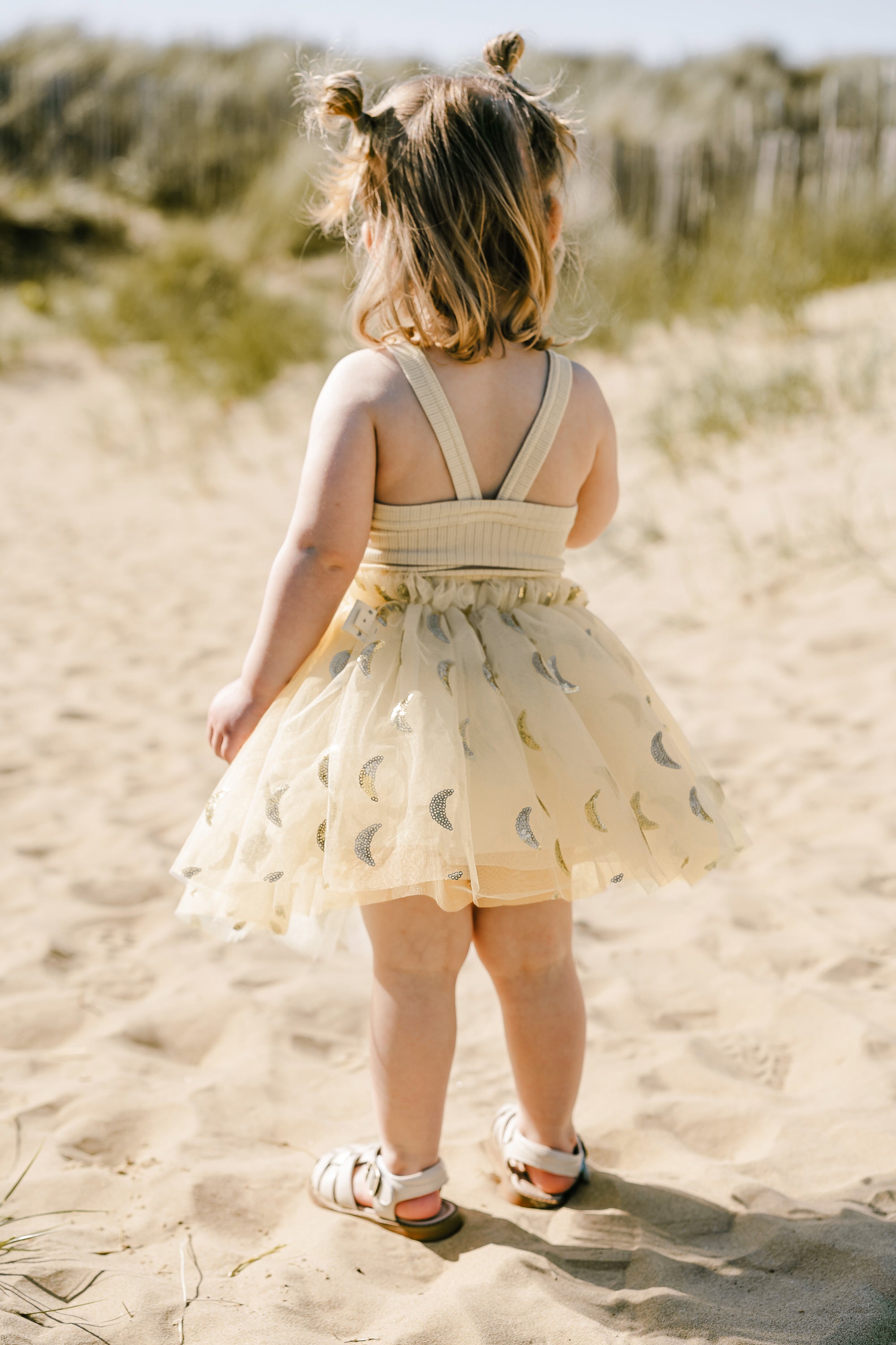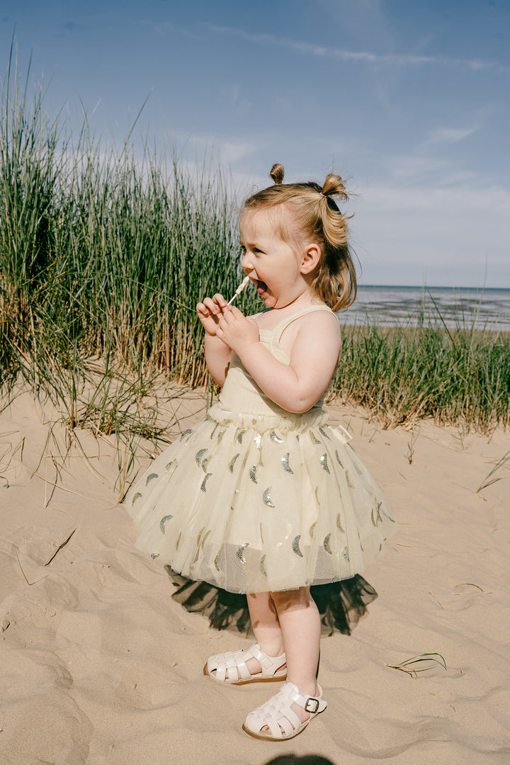 Princess-worthy silhouette with golden moon accents. Lightweight layered tulle flows gracefully with every step, making it perfect for parties, photos, and special moments. Soft on the skin and effortlessly magical, designed to make little girls shine.