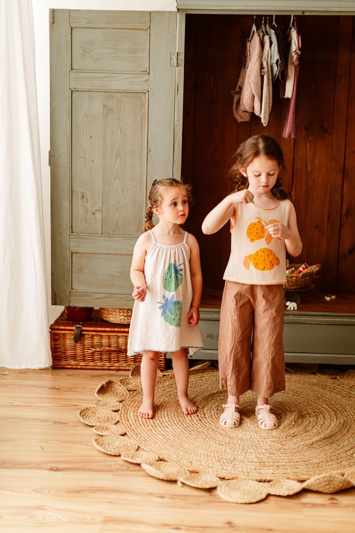 Designed with a lightweight double-layer yarn and playful fruit prints — choose from cheerful lemon or sweet strawberry. Sleeveless, breathable, and easy to pair with shorts or bloomers. Perfect for beach days, garden play, or just chasing bubbles at home.