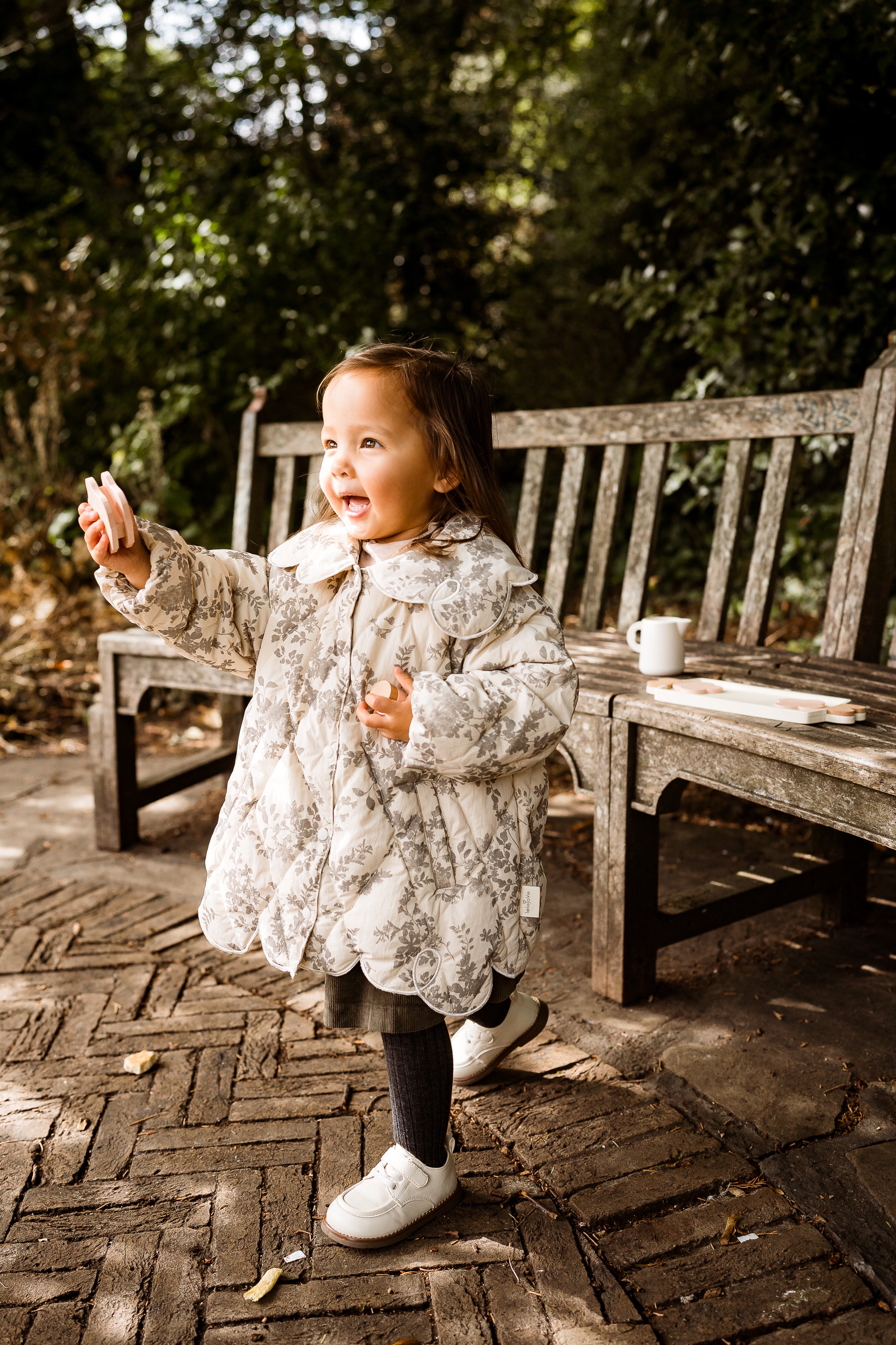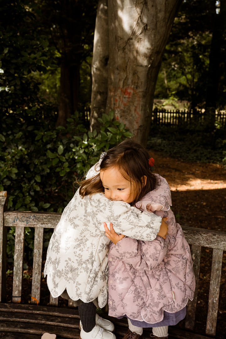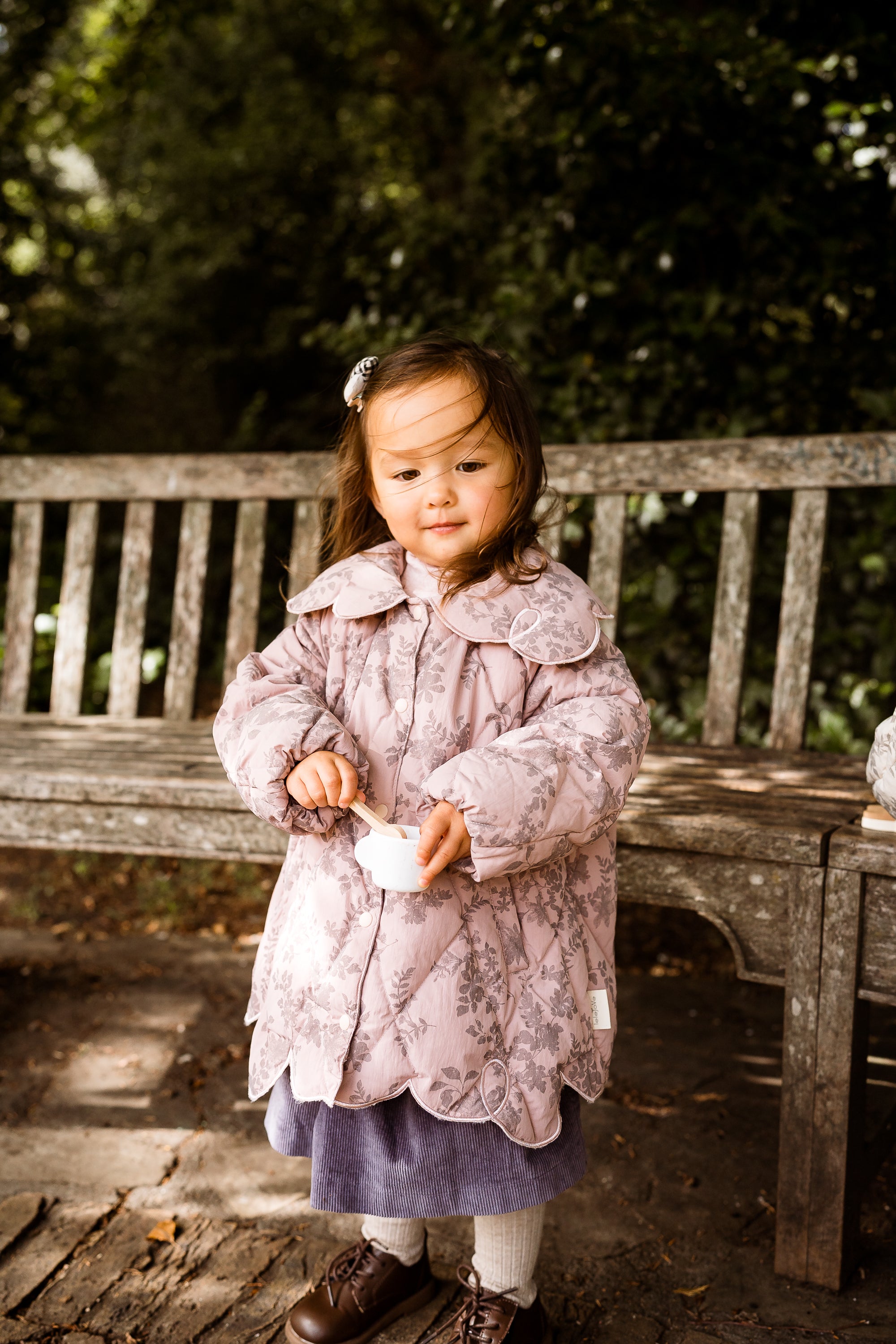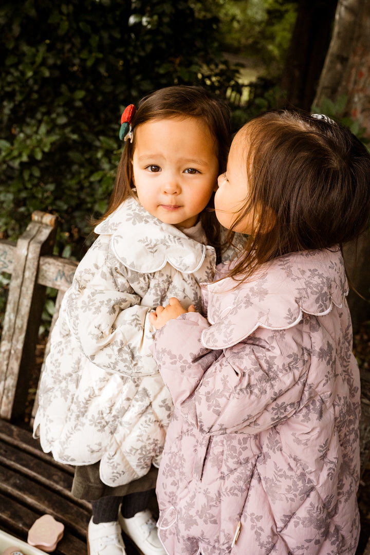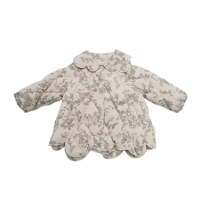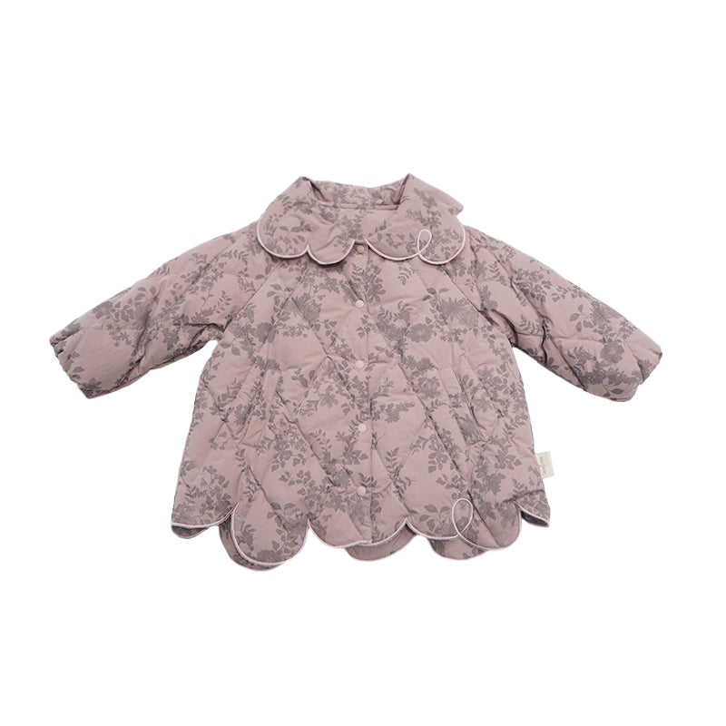 Graceful warmth for the colder months. This mid-length down coat features a softly sculpted petal collar that adds an elegant, feminine touch. Crafted from smooth, wind-resistant fabric and filled with premium white duck down, it offers exceptional insulation without bulk.