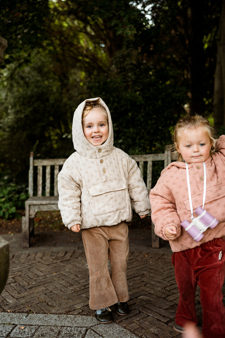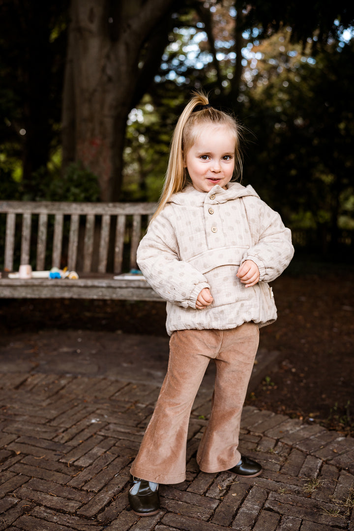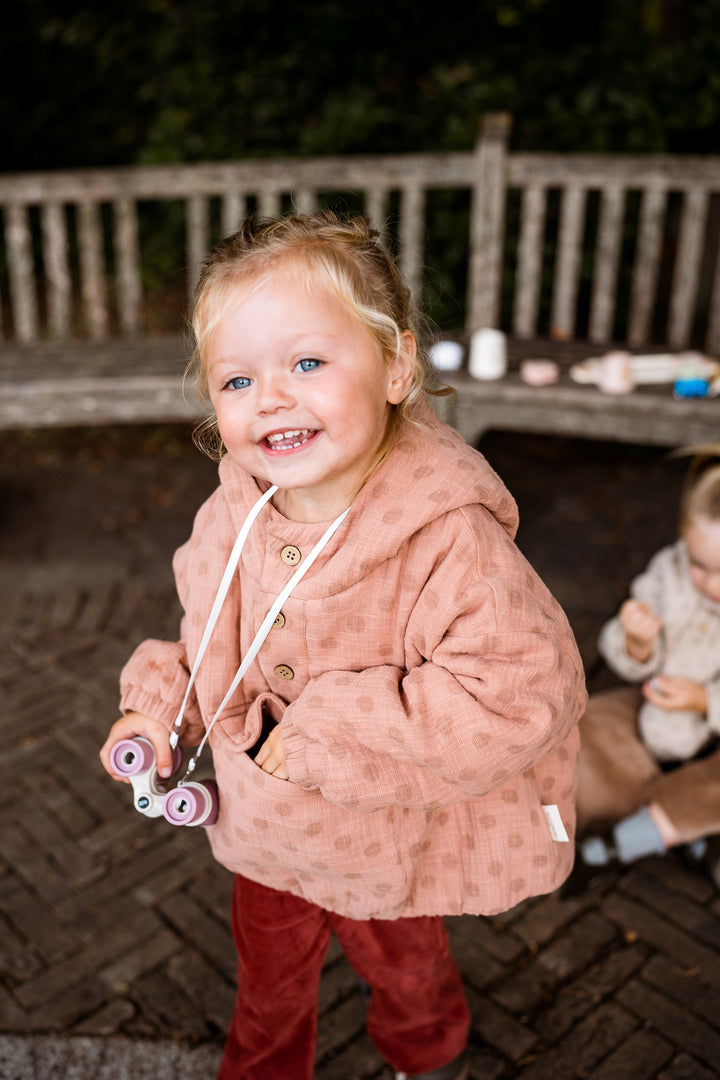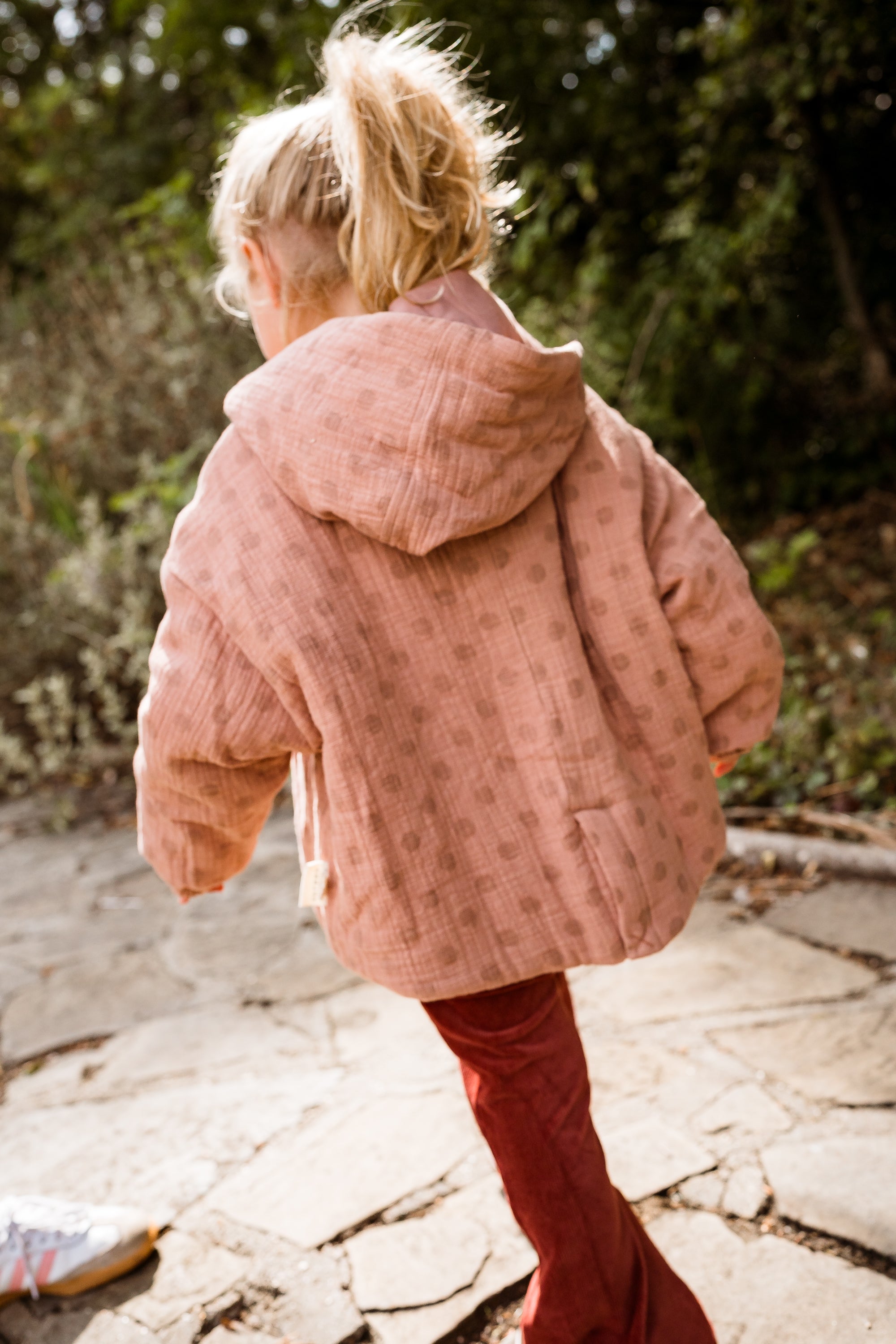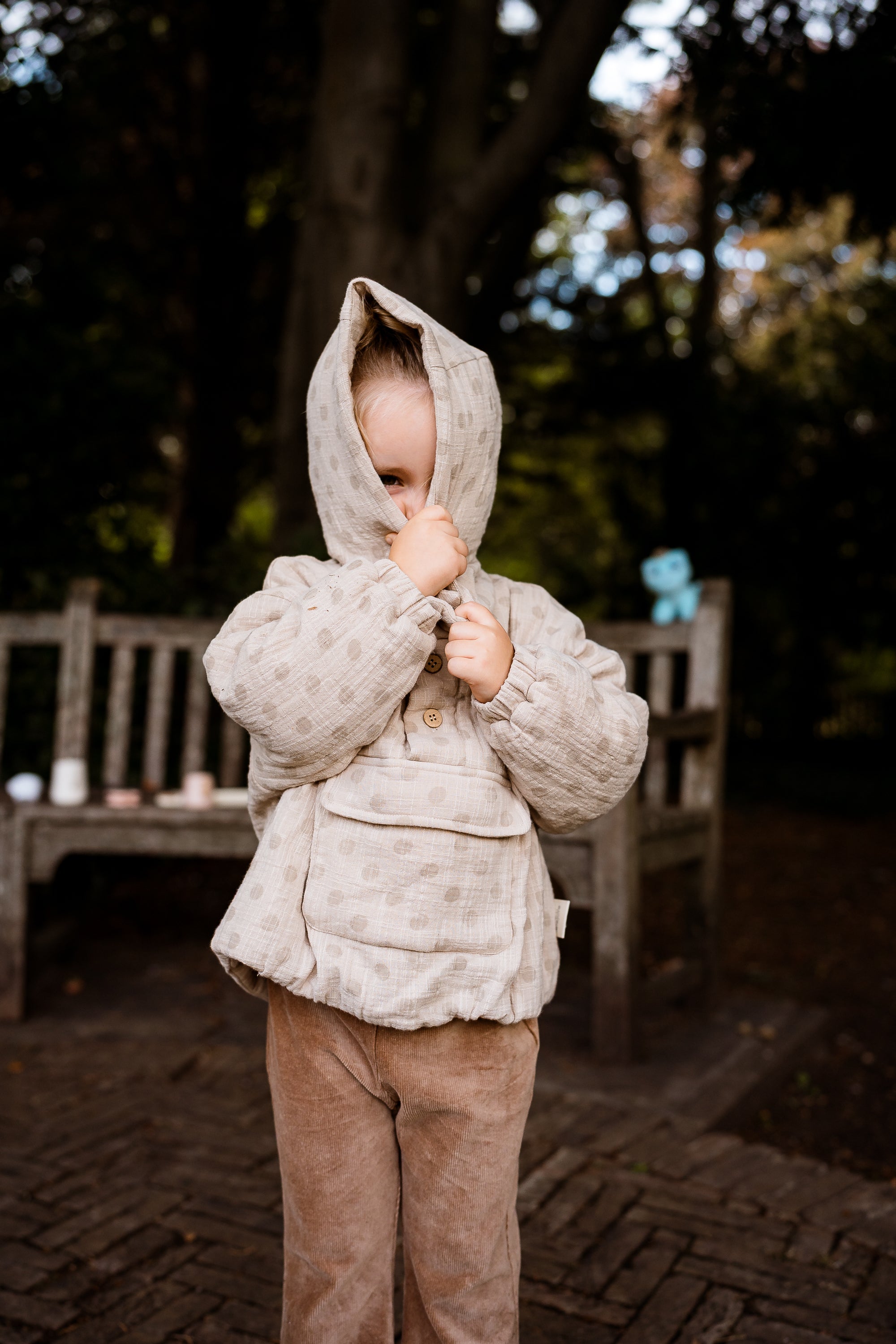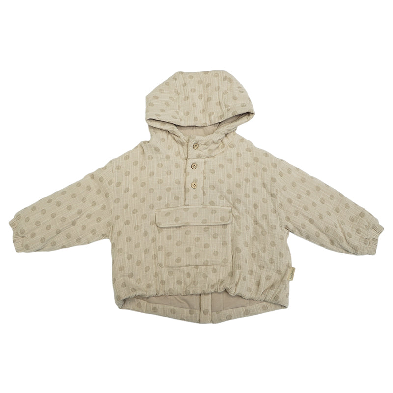 The cozy hood and long sleeves provide extra protection against the cold, while the playful dotted design adds a fun, stylish touch. Easy to pull on and ideal for layering, this jacket is perfect for chilly days at home or outdoors.