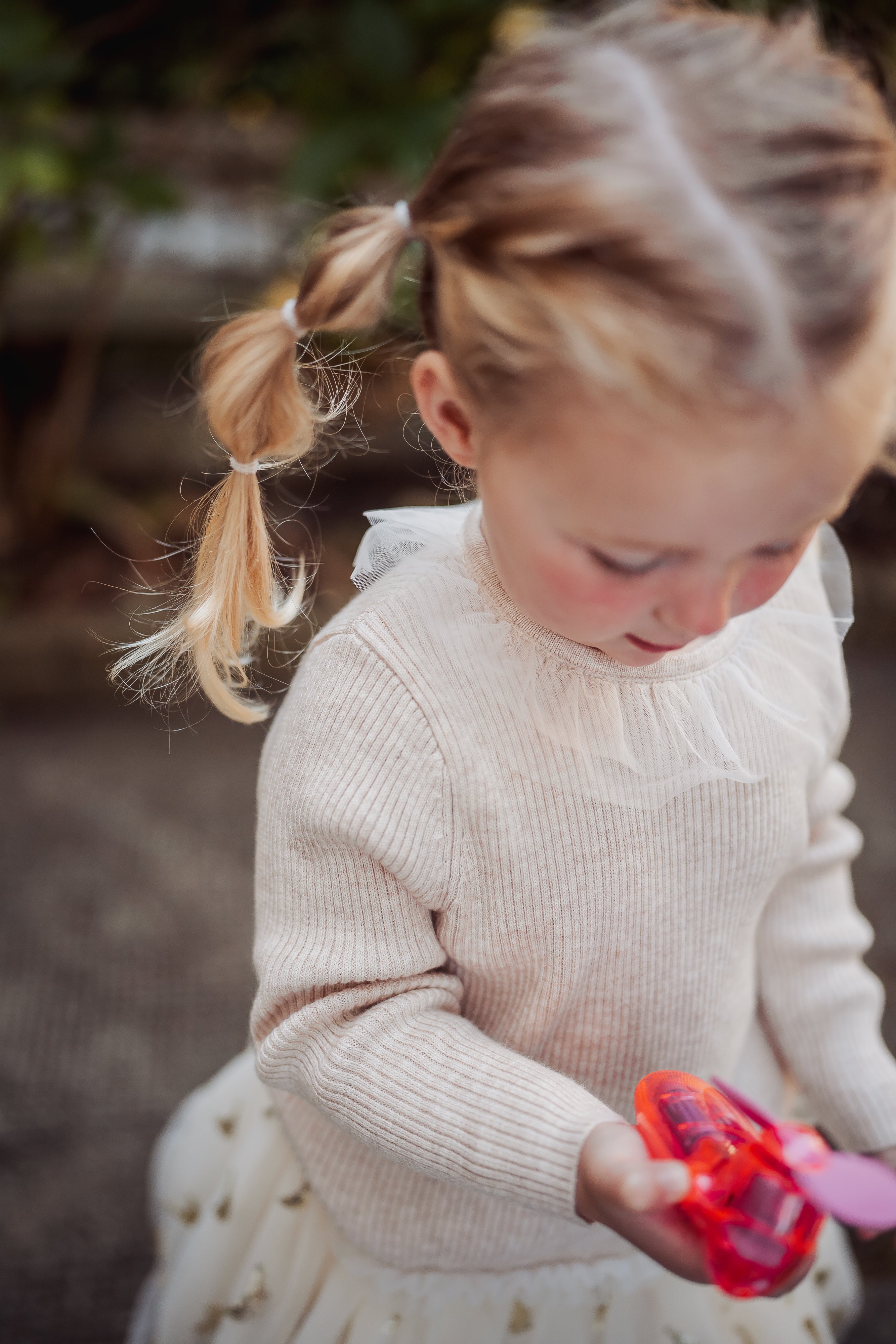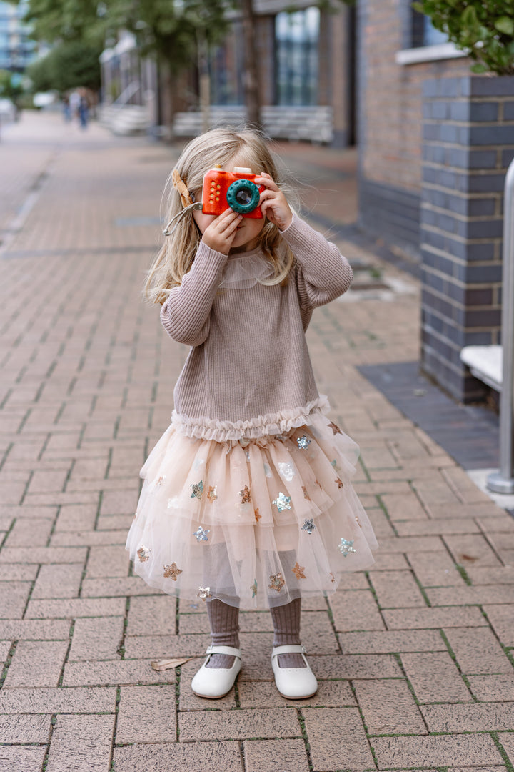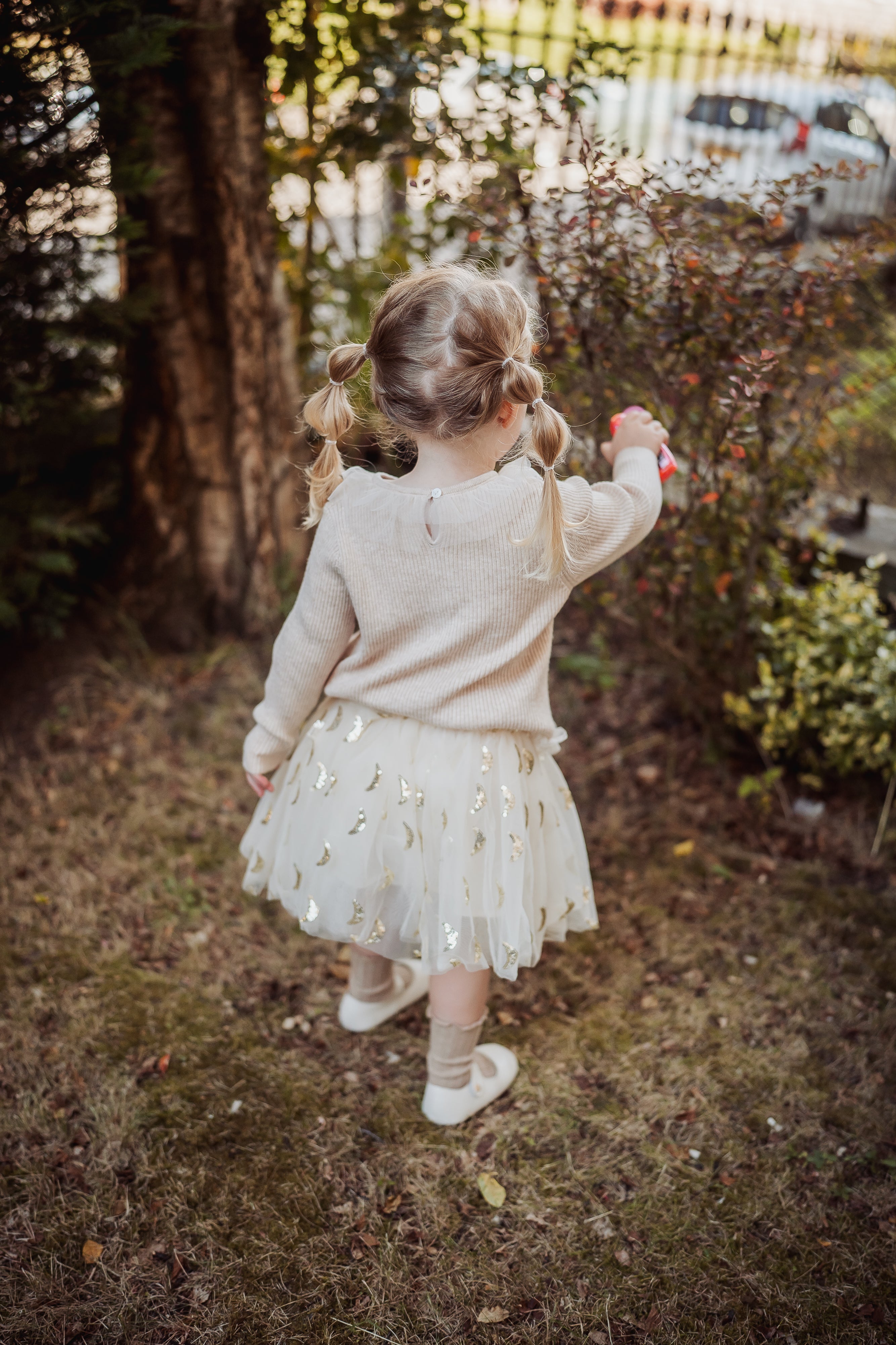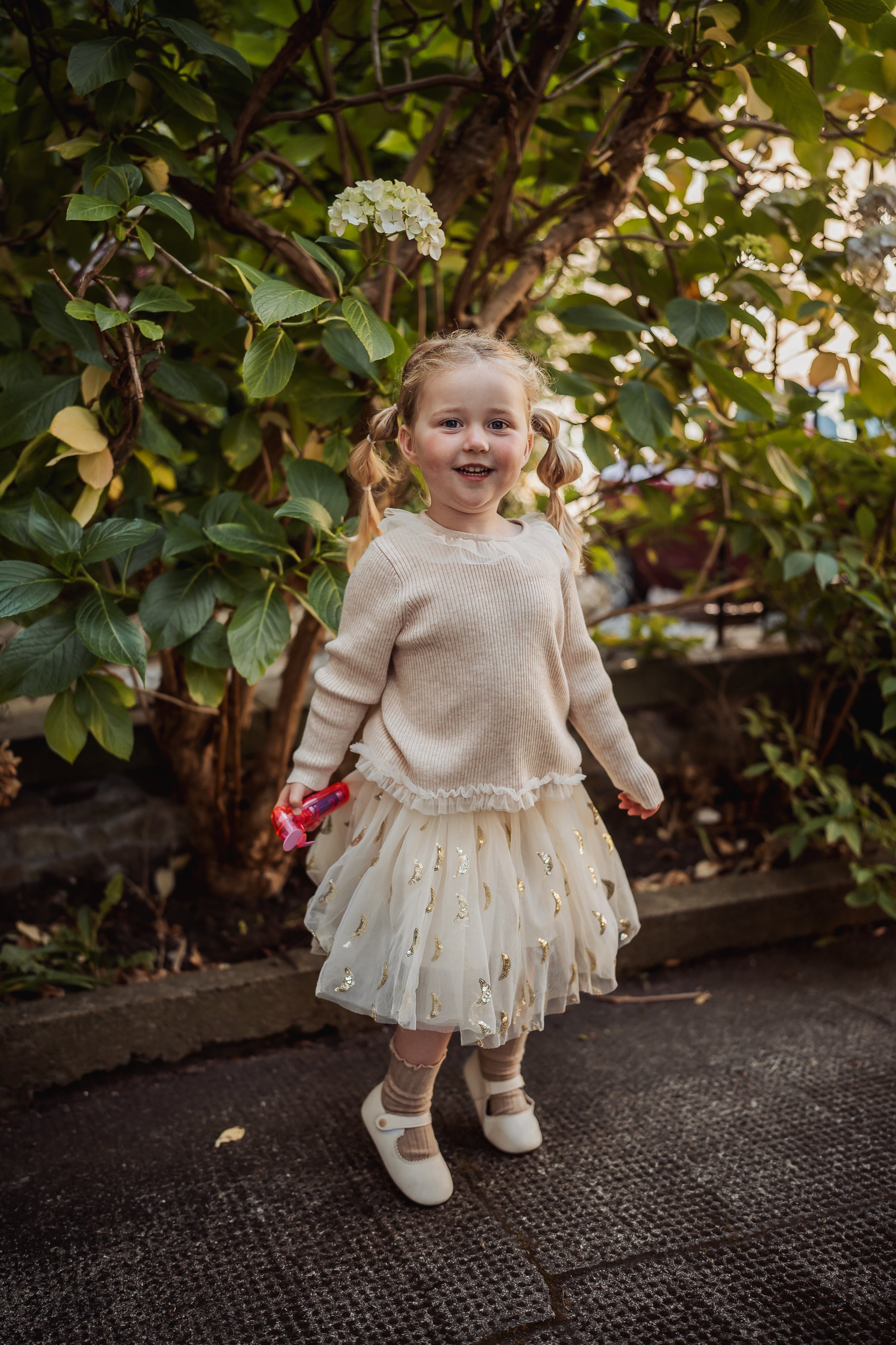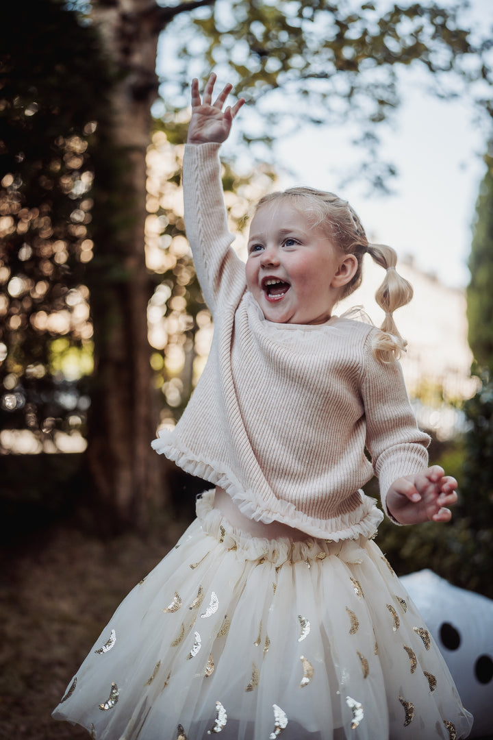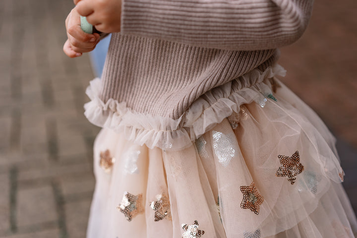 Crafted from soft, breathable yarn, this pullover combines gentle warmth with charming tulle accents. The fine knit construction feels soft against delicate skin, while the tulle trims add a sweet, airy touch.