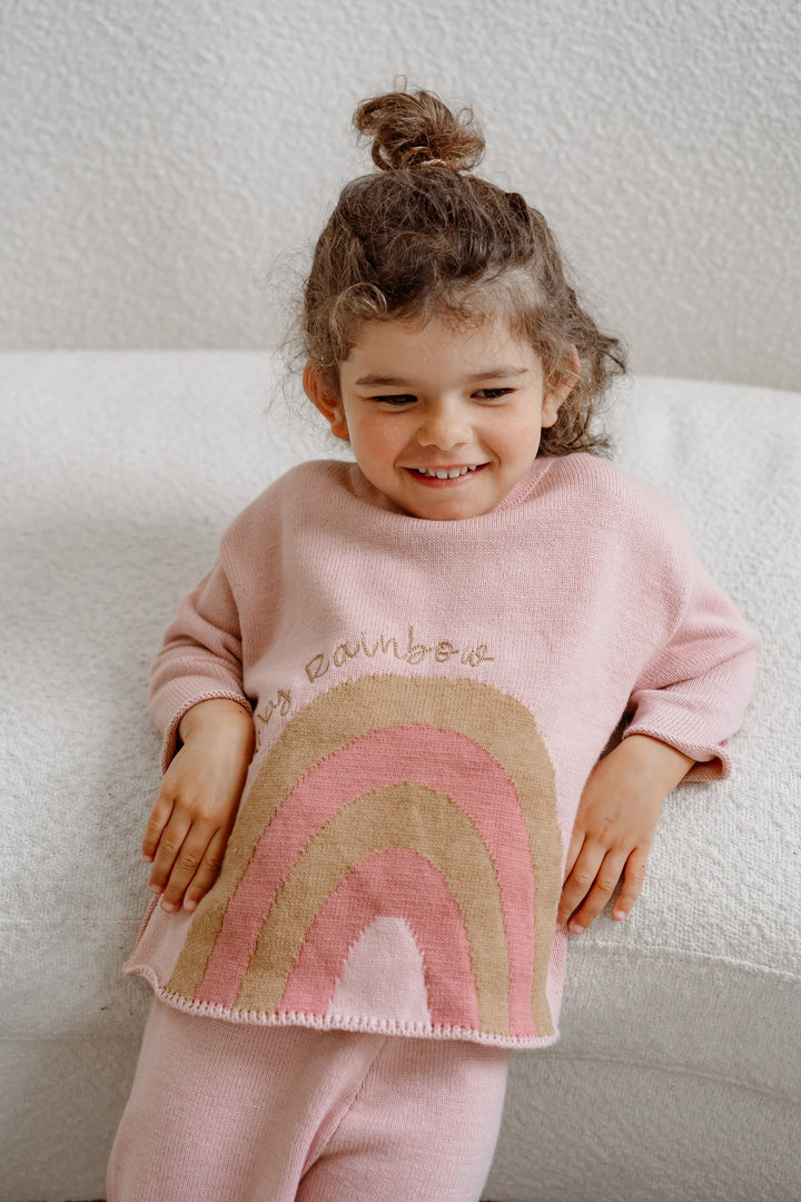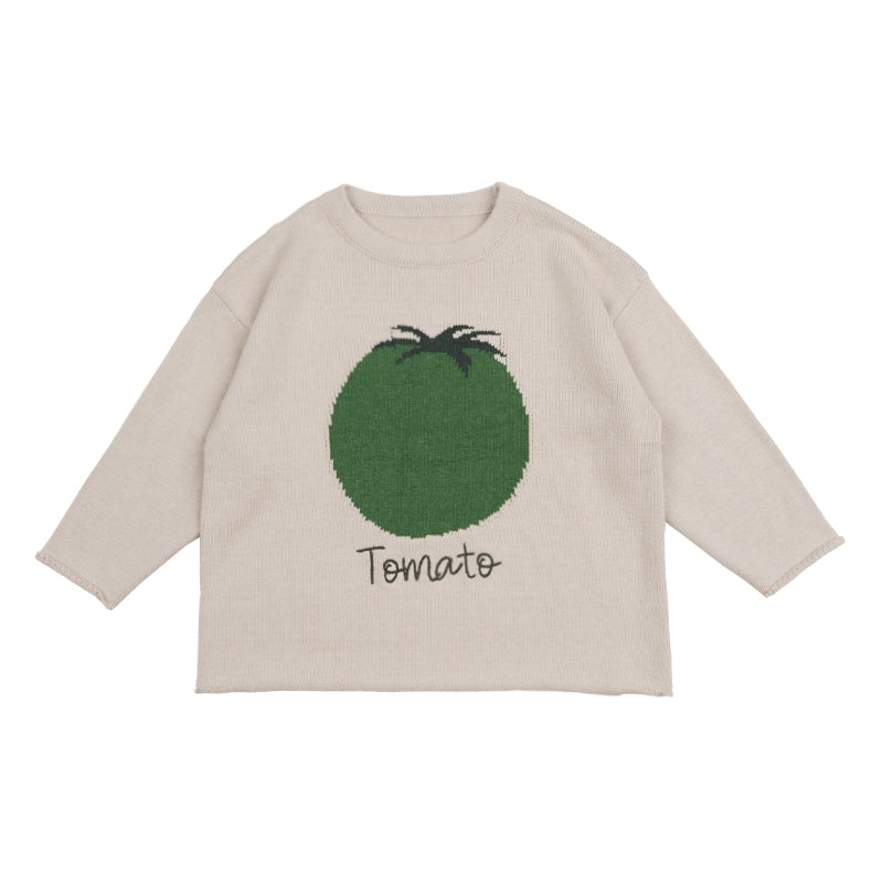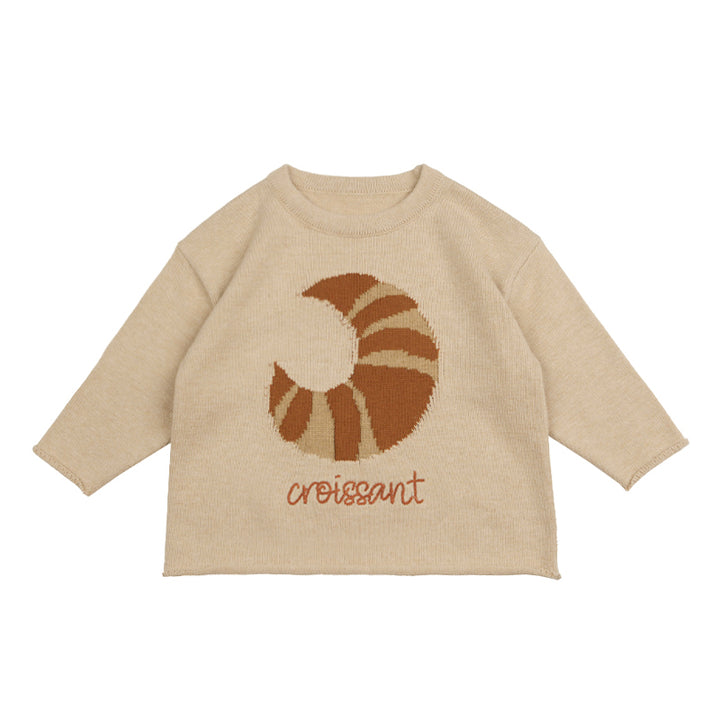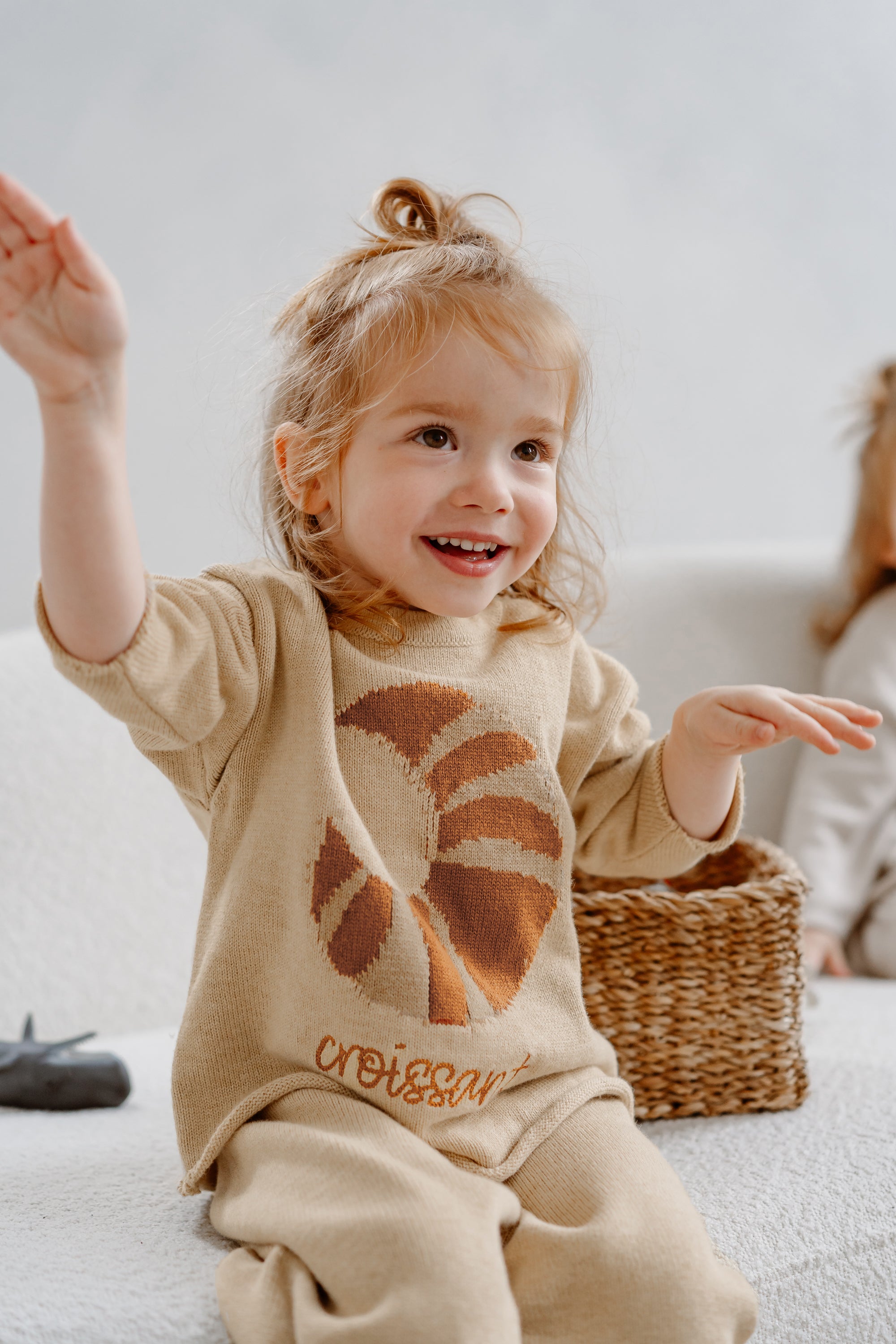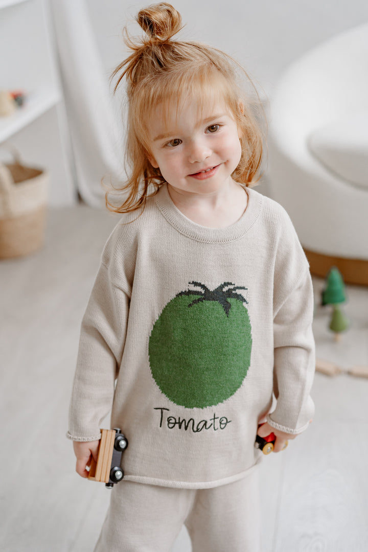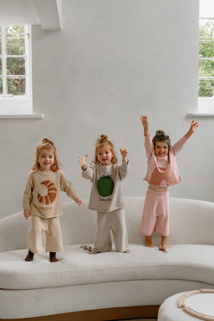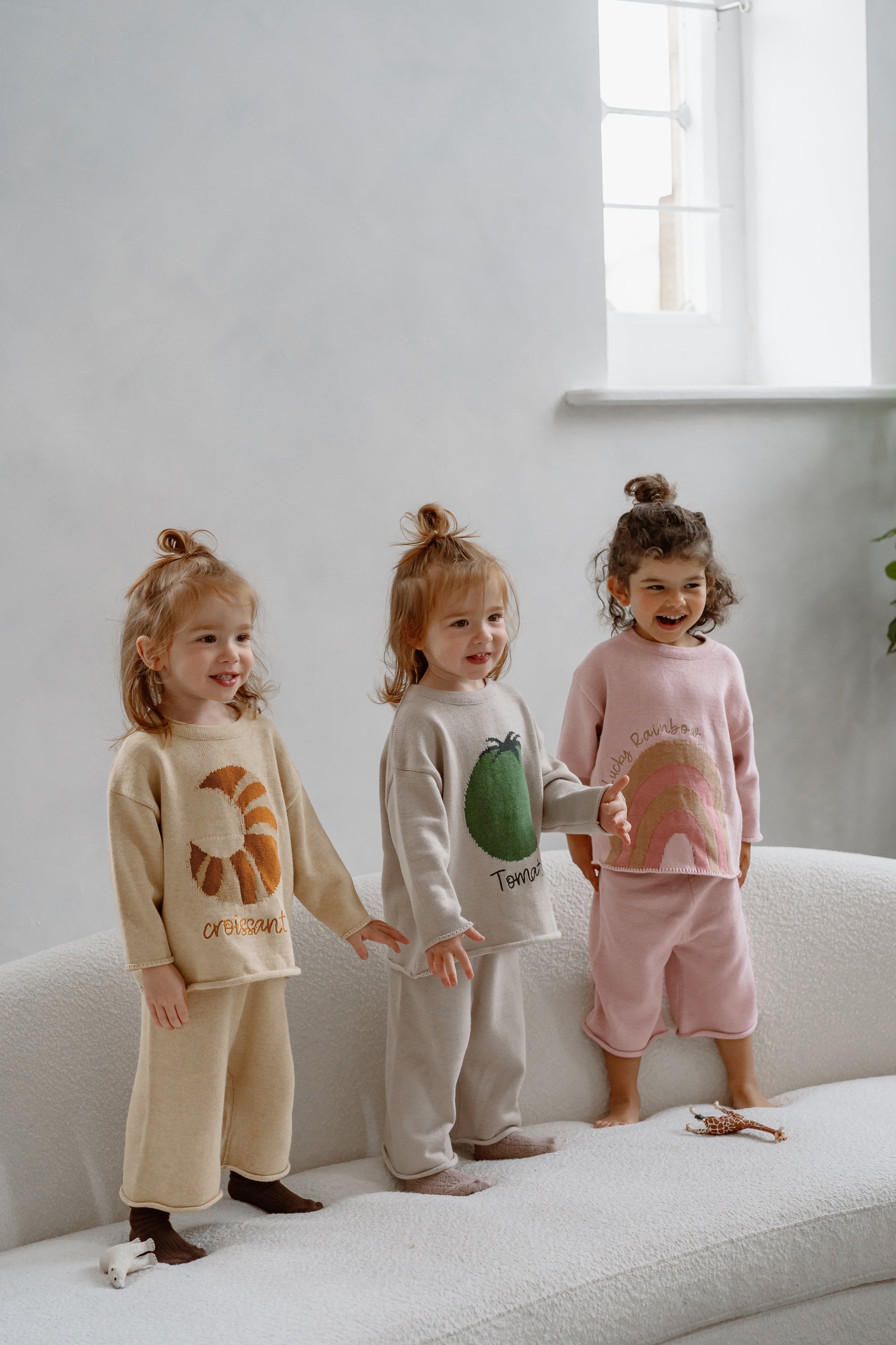 Cozy Nordic-inspired pullover knit set, each color featuring a fun and unique pattern — croissants, tomatoes and rainbows. The relaxed fit and pullover style make it easy to layer over shirts or under jackets, making it a versatile addition to any child’s wardrobe.